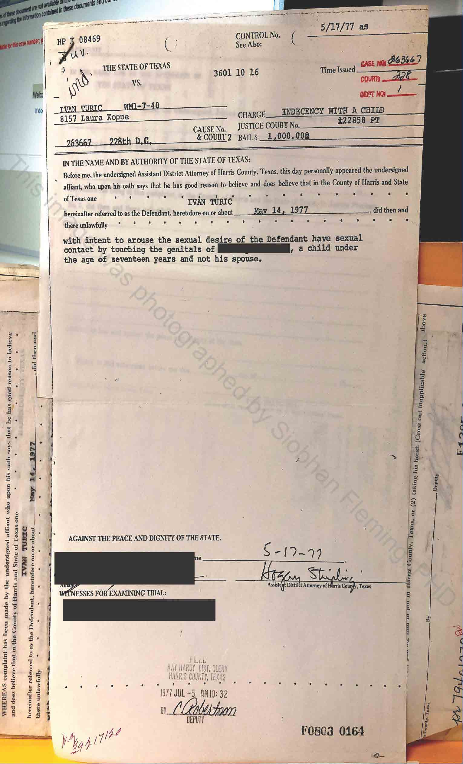 Which is exactly what happened on May 17, 1977 when a boy and his father filed a police report against Turic for indecency with a child. It was a felony complaint. The Harris County District Clerk file contains the information before the indictment: